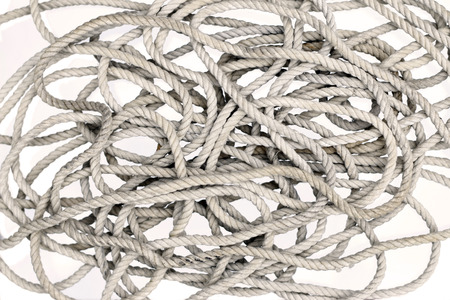 E Close multi colored black white yellow old fishing twisted cotton ropes heap pile jumble detail. Concept tangle mess mix mishmash maze, environmental protection rubbish, pale tone more in stock