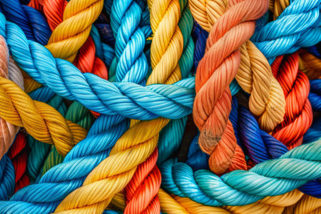 Intertwined ropes of diverse colors symbolize unity and synergy in teamwork, forming a strong, cohesive bond.