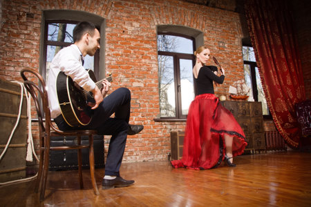 Young woman dancing flamenco in traditional flamenco dress with fan and a man playing the guitar
