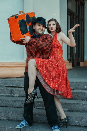Young couple dance retro jazz swing dances on a ballroom club wooden floor in retro vintage clothes dress, female and male, rock lessons, process of dancing