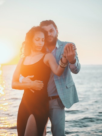 Portrait of young attractive couple dancing latin bachata near sea. Dance performed by a professional on ocean beach. Woman in sexual black dress. Sensual salsa, rumba.
