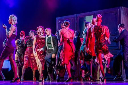 ODESSA, UKRAINE -July13,2019: Vivid erotic performance ShKAF. Sexy erotic women and boys in play act out sex scenes of provincial brothel. Sexual erotic scenes from fashionable nightlife performance