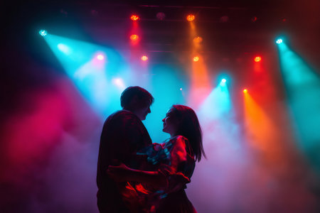 Romantic couple embracing and dancing joyfully under vibrant stage lights, surrounded by the electrifying atmosphere of a live music concert