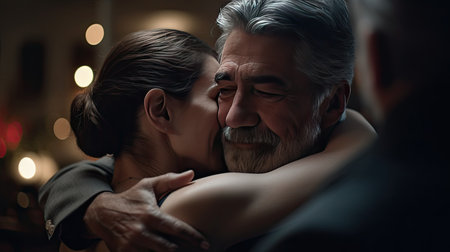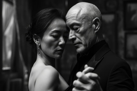 A black and white close-up captures a couple's intimate tango embrace, emphasizing the elegant and emotional connection between the dancers.