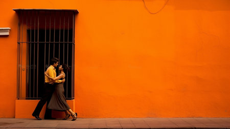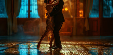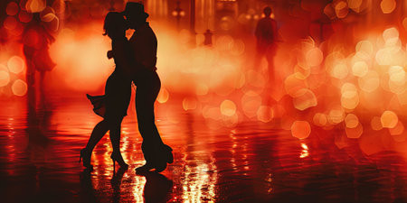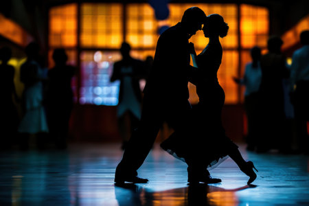 Silhouette of a couple lost in the passionate dance of tango, shadowed in motion