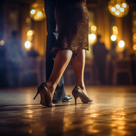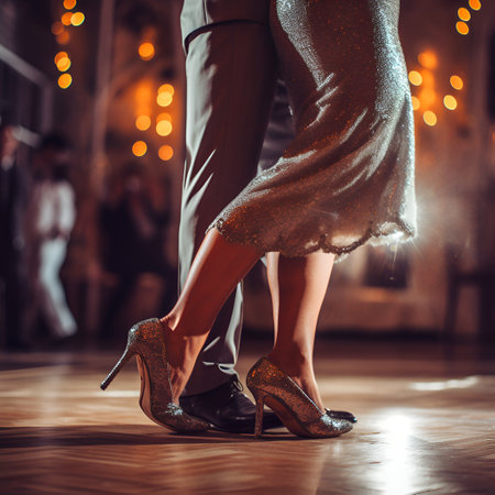 A woman's legs in shiny high heels and a man's legs in suit pants. The couple dances on the hardwood floor in a dance hall, AI generative content, close up.