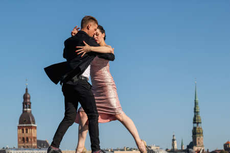 Young couple dancing tango against the old city background. Isolated on blue sky