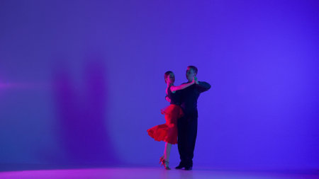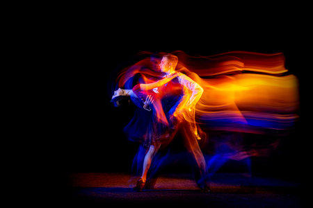 Dynamic portrait of young ballroom dancers dancing Argentine tango isolated on dark background with neon mixed light.