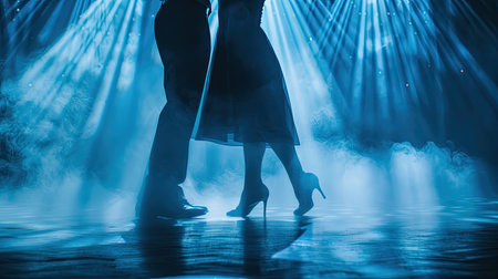 A tango couple's silhouette on a dimly lit stage, showcasing elegance in every move