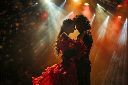 A couple performs a passionate dance on stage under dramatic lighting, creating a romantic and dynamic ambience filled with energy and emotion