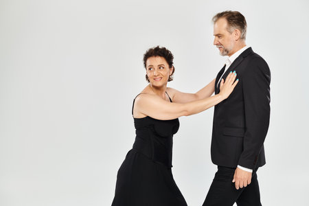 elegant couple of dancers looking at each other while performing tango isolated on grey