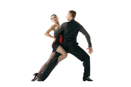 Flexible young couple dancing Argentine tango isolated on white studio background. Artists in black stage costumes
