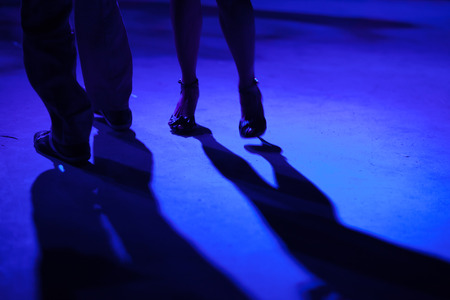 Dancing stiletto shoes of couples dancing traditional latin argentinian dance milonga in the ballroom, tango salsa bachata kizomba lesson in red and purple lights, evening dance school class festival
