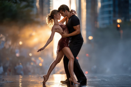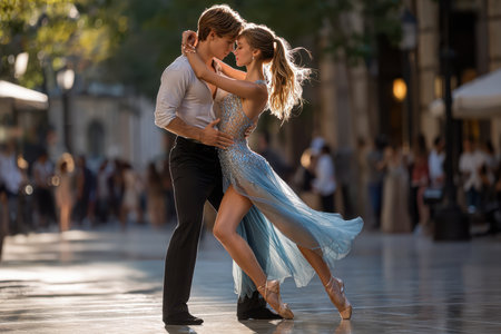 A couple performs a captivating dance on a lively city street as sunlight softly illuminates their movements.