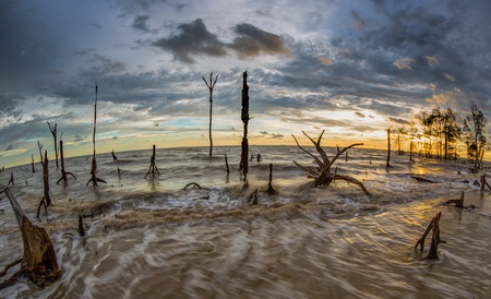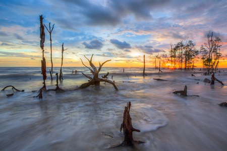 Dead trees in the sea at an eroded coastal line at Kelanang beach, Malaysia at sunset