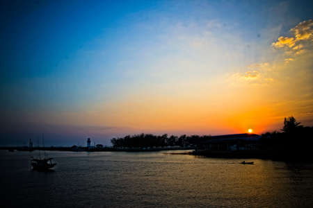 Beautiful Sky and sunset on the beach with Fishing boat silhouette.