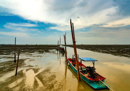Fisherman's boat parked at coastal mud flat at tide. Landscape of sea and beautiful blue sky and white clouds at sunset. Mud beach.