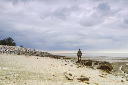 Guy in traditional dress of Malay beside the local beach covered with breathtaking blue sky.