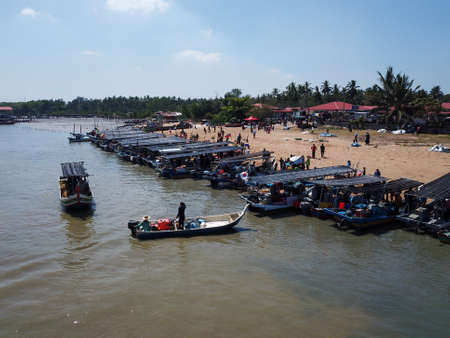 Merang Jetty Pier. Malaysia. July 25, 2025. Scenic view of Merang Jetty pier with moored boats and cars parked along the riverbank in a tropical location in sunny weather