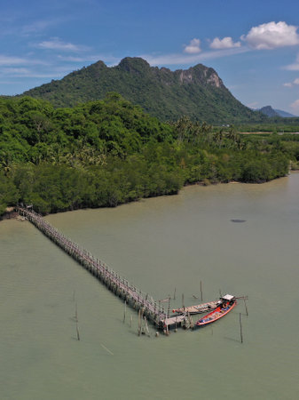 top view pier of Ban Samchong fishing village in Phang Nga Thailand