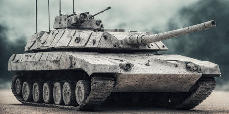 AI Generated. An abandoned tank stands in a deserted urban landscape under a cloudy sky