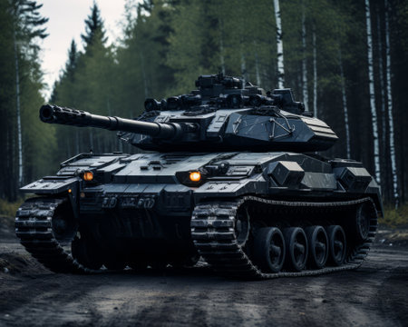 A powerful military tank is silhouetted against the dramatic colors of a fiery sunset. The imposing form of the armored vehicle stands starkly on the horizon, evoking themes of conflict, power, and the end of a long day on the battlefield.