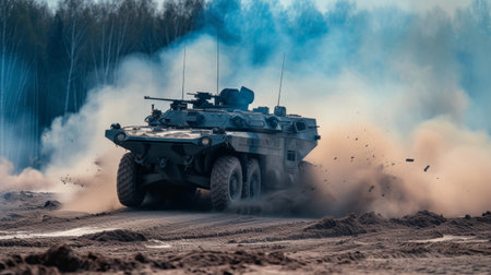 A military vehicle charges through a dusty field, its powerful presence marked by the swirling clouds of dirt around it