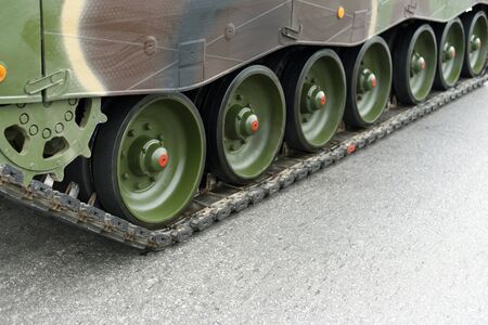Steel Military tank, detail of tracks or wheels of the off-road armored vehicle
