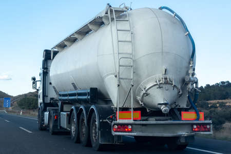 Silo truck for the transportation of bulk cement on a mountain road by the sea and at sunrise.