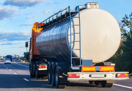 Petrol cargo truck driving on highway hauling oil products. Delivery transportation and logistics concept