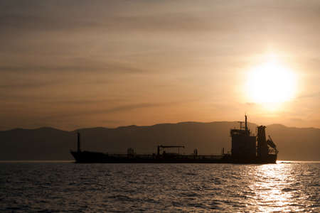 Large cargo ship (chemical tanker, 184 meters length) sailing in an open sea at sunset. Golden sunlight. Freight transportation, fuel, power generation, nautical vessel, logistics, economy, industry