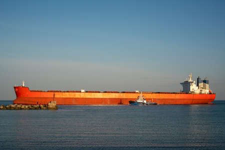 Large ocean-going cargo ship in orange. The dry cargo ship enters the port using a tug