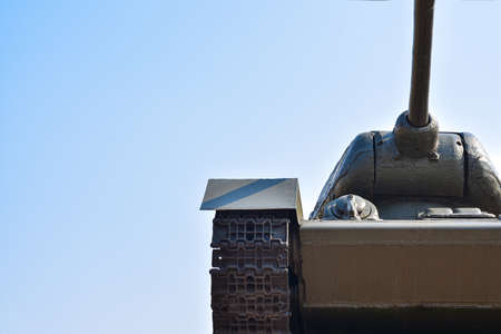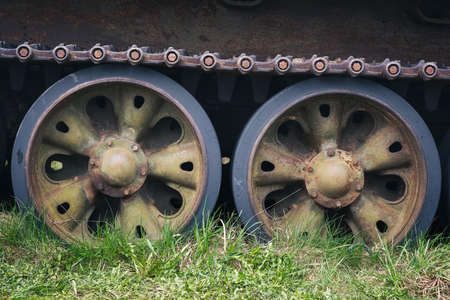 The front wheel and part of the track of an old rusty tank from the 1941 Patriotic War. Part of military equipment close-up.