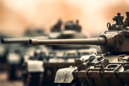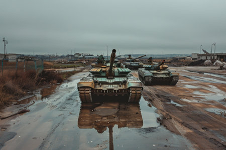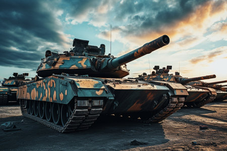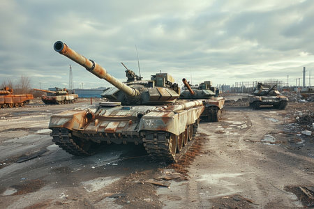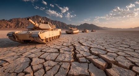 Armored military tanks are positioned on a cracked earth surface, surrounded by a dramatic sky and distant mountains, highlighting strength in a desolate landscape