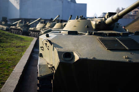 Parts of the hull of the armored infantry vehicle. In front and back of vehicle stays many different armored military vehicles. Military equipment outdoor open air museum.