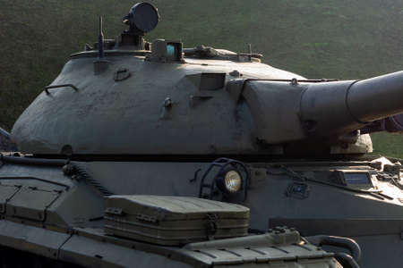 Parts of the hull of the old tank in the museum of military vehicles outdoor in the open air. Gun and truck parts closeup view.