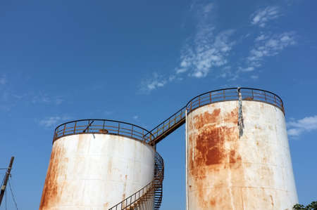 A pair of large industrial storage tanks featuring weathered metal surfaces against a clear sky. Ideal for backgrounds and industrial themes.