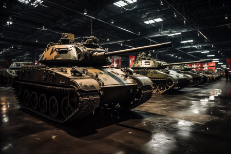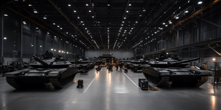 Rows of armored tanks are meticulously assembled in a spacious military factory. Bright overhead lights illuminate the sleek machinery, emphasizing precision and efficiency in production.
