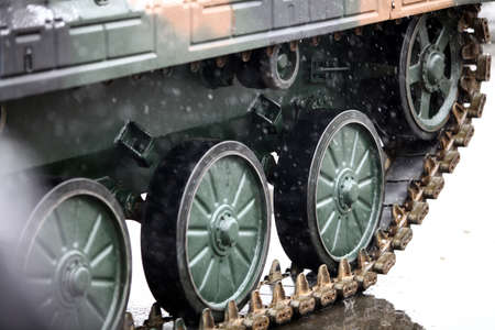 Tracked armor close-up. Black link tracks and large rubberized rollers. Chassis of an infantry fighting vehicle.