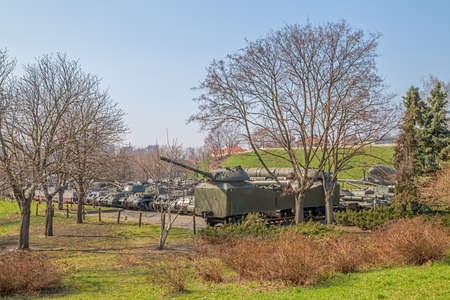 KYIV, UKRAINE - APRIL 10, 2019: Local Conflicts Museum; war machines of world war 2, tanks, helicopter, artillery guns, and Katyusha
