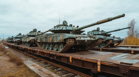 A group of military tanks is positioned on railway cars, showing their camouflaged design. The area features industrial structures amid a cloudy sky, indicating a strategic transport operation