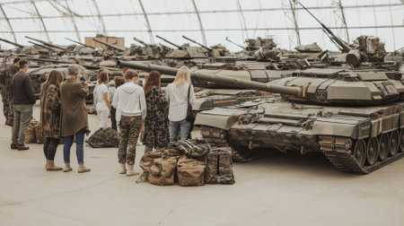 Visitors explore a European military factory featuring various tanks and weaponry. The setting is modern, highlighting significant military technology.