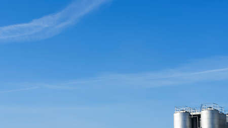 Part of steel tanks of silvery color on a background of the blue sky. Space for text. Winery or petroleum concepts. Series of stainless steel containers for wine.