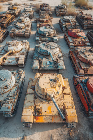 An aerial view captures a desolate area filled with discarded military vehicles. At the center stands a striking yellow tank, surrounded by various rusting armored vehicles, showcasing the remnants of past conflicts under a clear sky.