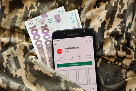 TERNOPIL, UKRAINE - APRIL 24, 2022: PUMB banking application on smartphone screen. PUMB is an important commercial bank in Ukraine