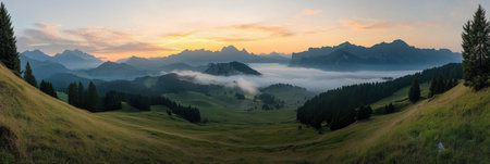The early morning light reveals a breathtaking landscape with mountains shrouded in mist and vibrant green meadows.