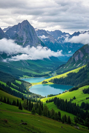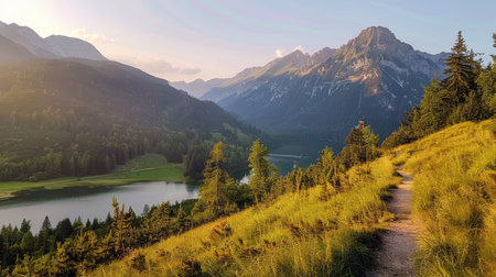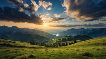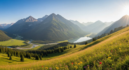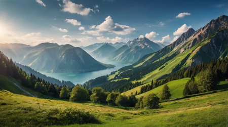 A tranquil landscape depicts a mountain range, a calm lake reflecting the sky, and lush green valleys. The composition uses natural colors, creating a serene and vast vista. The scene is lit by sunlight and suitable for environmental or travel content, conveying peace and natural beauty.