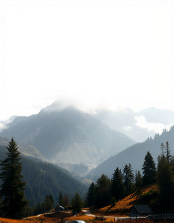 Winding asphalt road navigating through pine trees and fog, ascending towards a mountain peak. Winding mountain road leading to a foggy Alps peak