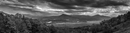 Panoramic view of the mountains and meadow. Beautiful summer landscape.