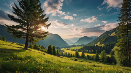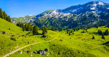 Panoramic view of idyllic alpine meadow with mountain range in background